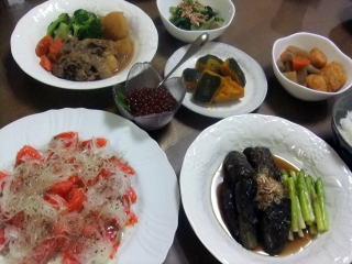 夜:肉じゃが、ナスの揚げびたし、かぼちゃの煮物、サーモンのカルパッチョ、いくら他
