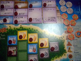 2回戦目は、村がこれまた1人でコーヒー生産+3番スタートで恵まれていた+とうもろこしもそこそこ取れたので、貿易・建物ともに完勝でした。