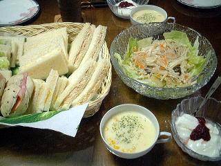 昼:サンドイッチ各種、春雨サラダ、コーンスープ、ヨーグルト。