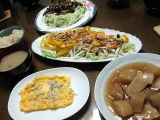 夜:栗ごはん、みそ汁、シラス玉子、大根とカジキまぐろのあんかけ煮、レバーと鶏皮のスタミナ炒め