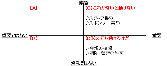 ――企画を進めるにあたって、スケジュールの管理はどうされていたんですか? 2年目以降であれば昨年のスケジュールがわかっているので、時間配分がしやすいんですけど、初年度だとそうはいきませんよね。 僕らも最初は何から手をつけていいのかわからなかったので、まずは「やりたいこと」と「やらなければいけないこと」を全部洗い出すようにしました。 ――なるほど。思いつくままに洗い出すことで“やるべきコトの棚おろし”をするんですね。 そうです。棚おろしが出来たら、次にそれぞれの案件を下図のような表に落とし込んでいきます。 緊急度と重要度といった2つの軸で分類するんですね。 |