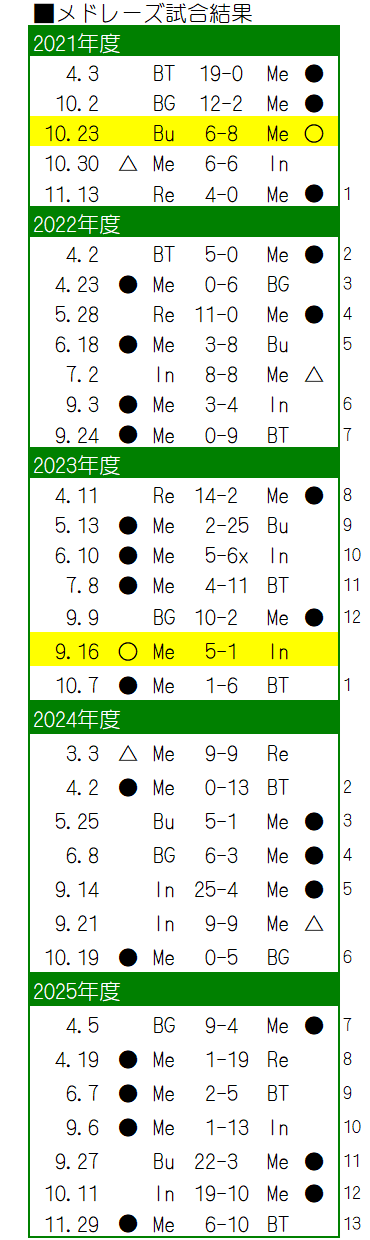 2025年11月29日、メドレーズが連敗記録を『13』に更新した。それまでのメドレーズの連敗記録は2021年から2023年にかけての『12』連敗(下表参照)。今回は2023年9月16日の対インスパイア戦に勝利した後、引き分け2試合を挟んで連敗が続いていた。