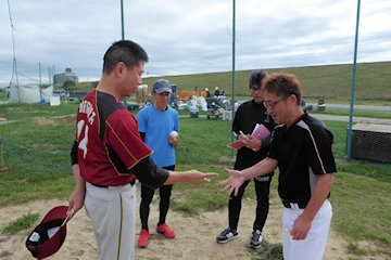 そして弟の佃大からは兄からの言伝として「先攻でお願いします、とのことです」とジャンケンに勝つことを要求される波乱の朝でした。当初から今日は、10分前到着予定の3人含めて9人体制で、10分前でまだ6人しか集まらず、、、ジャンケンで負けた時を想定して、とりあえず先発ピッチャーは、「ミスター・ノーサイン」北出を指名しました。