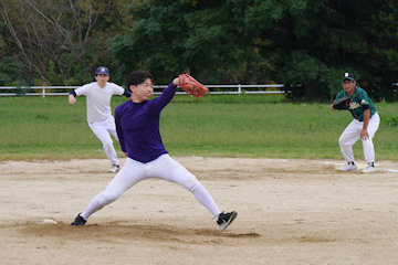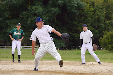 しかし2回表に海本と岡本元の連打の後、高良の同点タイムリーが出て振り出しに。その後4回には先頭の海本から四球を挟んで6連打を放ち、最後の小西は左越え本塁打と、ノーアウトで7点を奪取、2死後海本も左中間本塁打で続き、1イニング9安打(内2本塁打)で8点。6回にも4点、7回には海本の今日2本目の本塁打と7~9番の50代トリオ(岡本親・高良・三吉)の連打で加点し、試合を決めた。