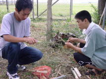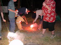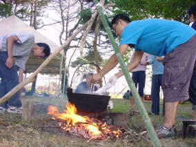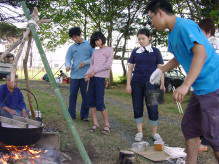 参加者はおよそ30人。高校生とそのOB達(7回目の人もいた)、地元の人達など、おそくまで百里の夜を満喫?しました。竹で食器をつくり、バーベキューに舌鼓を打ち、花火を楽しみました。若者達は夜明けまで話し込んでいたようです。「ここにくると自分を出せる」と言う人もいます。朝は5時起きして、飯ごう炊さんと青竹でご飯を炊 いて食べました。