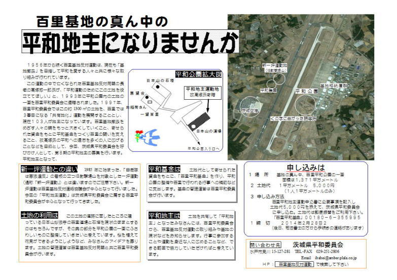 | 申し込み方法 | 平和地主運動申込書(所定の用紙)、土地代を添えて、茨城県平和委員会に申し込む。 |