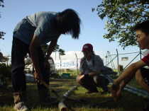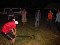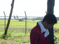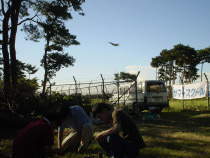 ギターを囲んでの交流会、スイカ割り、風が強かったので花火はできませんでしたが、楽しい一夜を過ごしました。翌日はだいぶ寝不足だったようですが。たき火での朝食づくり、反対同盟の川井さんのお話、平和に着いての話し合い、昼食のすいとん作りと色々な体験をしながら、百里基地を見て、感じて、平和を考えた2日間でした。