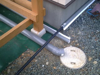 そこから先はデッキの束柱の横をPV管を通し、玄関側まで出るように配管しておきます。