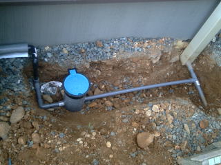 配水管は玄関側から80mmの管を這わせて東側の排水枡に排水を落とすように準備しておきました。