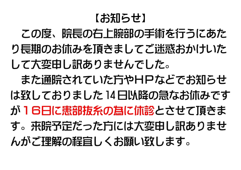※院長が上腕部にある粉瘤の除去手術を行います。手術及びその回復期間をお休みとさせて頂きます。ただ回復状況によっては、上記期間以降でも数日間は腕に負荷が掛かる施術(骨折・脱臼の整復、一部のマッサージ、ストレッチ等)に制限があるかもしれません。その際は施術前に相談させていただきます。