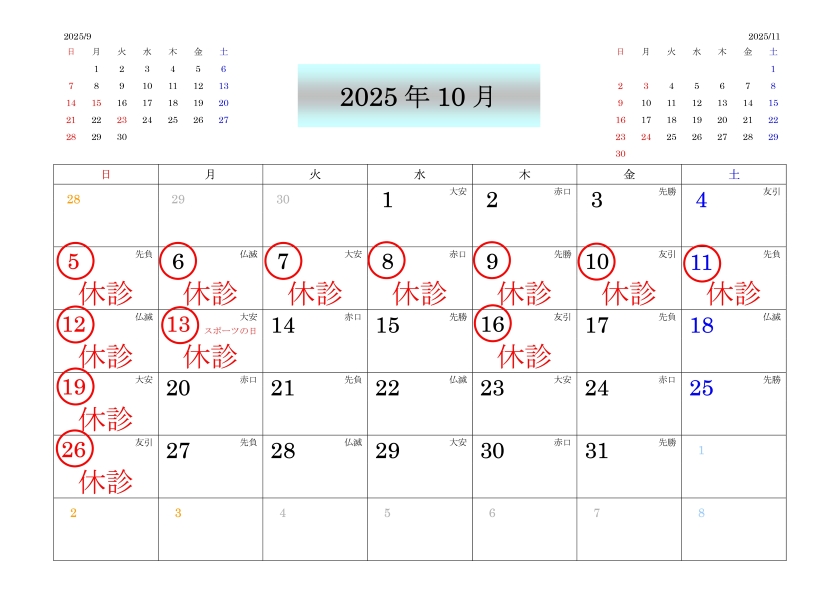 ※10月2週目(13日以降)ですが、今の所決定事項ではないので予定に入っていません(決定次第お知らせいたします)が抜糸の為に1日休診する事がございます。この週は予定表を確認の上、来院して頂きます様お願い致します。