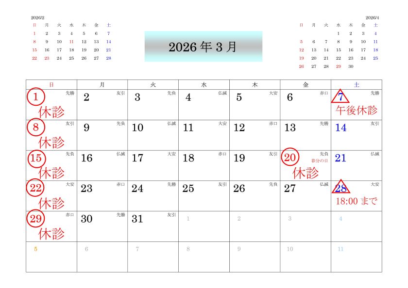| ※令和8年3月7日は、院長の都合により午前中は通常通りの施療を行い午後は休診致します。 |