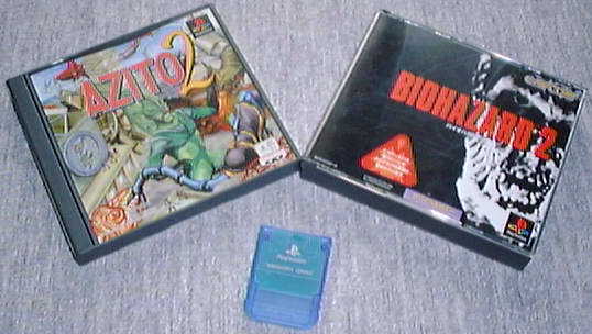 | 右は、ご存知「BIOHAZARD 2」。これだけなら、わざわざ写真で紹介したりなんてしません。 問題は左側のソフトです。 AZITO2。「妖怪人間ベム」のようなタッチのおどろおどろしいイラストのパッケージ。 ゲームにはつきものの、ストーリーっていうものがあるのですが、これがまた脱力です。ストーリーには「正義側物語」と「悪側物語」の2種類が用意されています。その両方に共通している部分は・・・