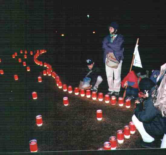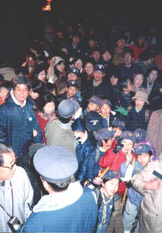 24:00 東大寺前 零時ジャストに開門される門の前で待つスカウト。しかし、参道はすでに人で埋まってます。 ここから、命がけで正面突破を試みます。リーダーは子供たちが倒されないよう、はぐれないよう、身を挺して前進しました。 しかし、よく全員無事で迷子もなく大仏殿に入れたものでした。 |