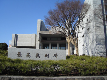 左は、記者会見する「中国残留孤児訴訟」鹿児島原告団と増田弁護士。右は最高裁判所(東京・三宅坂)。