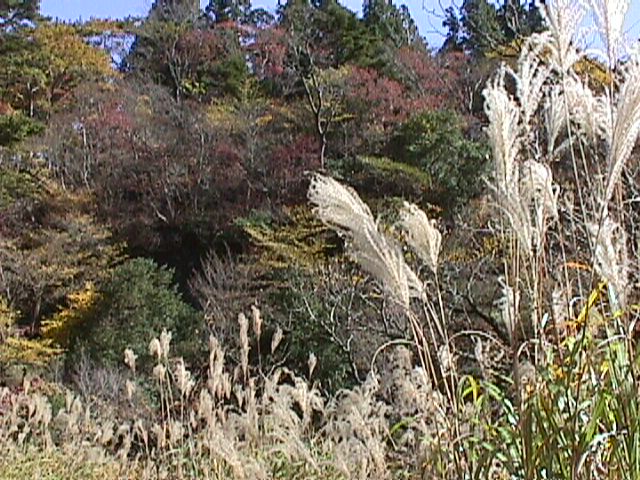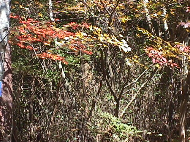 新湯温泉あたりはすでに車でいっぱい。駐車するところが見つからず、やや離れた道路脇にとめた。歩き始めて1時間くらいは林道を歩く。林道の終点である川岸当たりは紅葉がきれい。このコースは霧島では紅葉の美しいところと聞いた。しかし、それほど「全山これ錦」といったほどの鮮やかさはない。南の国ではどうしても、紅葉はいまひとつ。