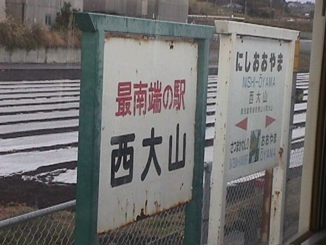 JR九州2日間乗り放題割引切符をつかって、枕崎まで行くことにした。これまで指宿までは行ったことがあったが、それより南には行ったことがない。時刻表でしらべたら、枕崎まで行く列車への接続は12時までなく、西鹿児島を12時すぎに出発。約1時間で指宿へ。かつおで有名な山川を経て、南薩摩路にはいる。寒い一日で、途中で南国には珍しいみぞれになる。開聞岳も雲にかくれて、よくみえず。山川から二つ目の駅=西大山が最南端の駅。ホームにその案内表示があるだけの無人駅である。