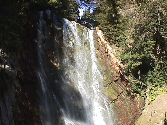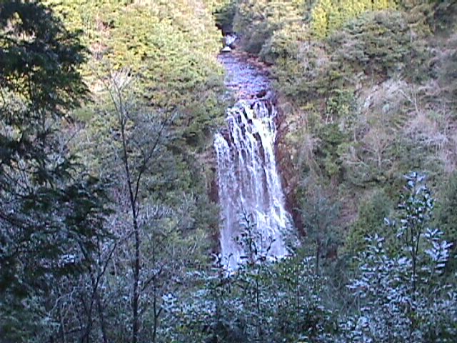 「旅行人山荘」はもと霧島プリンスホテル。施設はあまり立派とはいえないが、丸尾温泉としてけっこう由緒ある旅館であるらしく、幾多の俳人、画家の色紙やらがロビーにかざってある。このホテルから10分ほどのところに「花房の滝」がある。赤い色をしたがけを水が流れ落ちる。