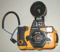 モーターマリンUの本体です。 ピントも絞りも手動で、ピントはレンズ左のフォーカスダイヤルで。絞りは、右の絞りダイヤルで合わせます。 レンズは35mm、F3.5(水中では被写体は大きく写るため、35mmが標準レンズになります) シャッター速度は1/100。(現行のモーターマリンUEXは、シャッター速度を4段階変更できます。) |