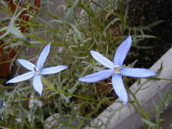 日当たりのいいところでは、 星形のかわいい花がたくさん咲くので、 単独で植えて大きく育ててもみごと。 うちでは、プランターに寄せ植えしてます。 葉も細くて花と共に風にゆれるのがいい。 開花中は液肥を月1〜2回あたえます。 こまめに、花がらをつみますが、 アルカロイド系の白い樹液が出るので 注意! 株分けで、増やせます。 |