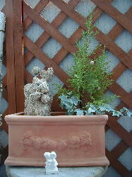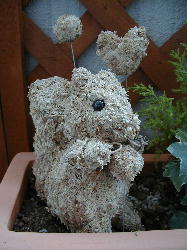はじめて作った水苔のトピアリー。 リスのかたちをした針金と水苔がセットになったものを 購入。説明書に書いてるとおりに、水苔を水につけて もどしたら、こんなに小さなリスの中に入るの? っていうくらい量が増えてびっくり。 ぎゅうぎゅう押し込んで、外からも水苔をくっつけて 後はテグスを巻き付けながら形を整えた。 目もセットになってたのをつけただけ。 だいぶつめこんけど、それでもあまったので ハートと球(りすが持ってる)のピックを作って差した。 ほんとは、リスのいるところに“かすみ草(ガーデンブライト)” が植わってたんだけどねぇ。 5月に虫にやられちゃった。 つぎ、何植えるか考え中。。。 |