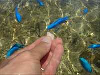 そして、「サンゴ礁の海」のコーナーでは、午前中の餌付けタイムで出会った青い魚と再会!