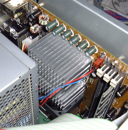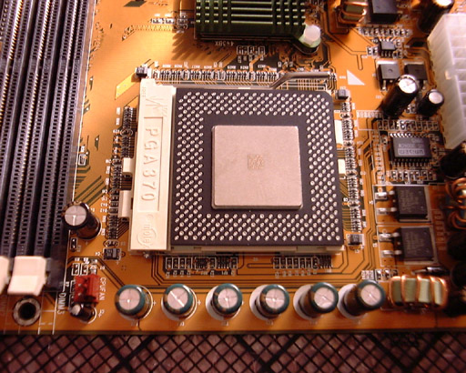 特大ヒートシンクはマザーボードの隅にあるコンデンサに触りそうなぐらい大きく、ソケット370のレバーにあたってしまいました。(^^;)