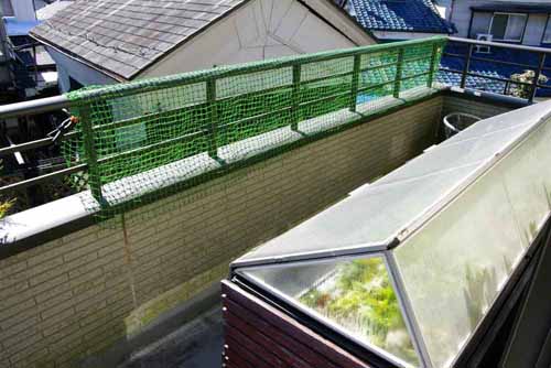 手摺りに止まってフンをするのでゴルフネットを買ってきて手摺りに掛けています。