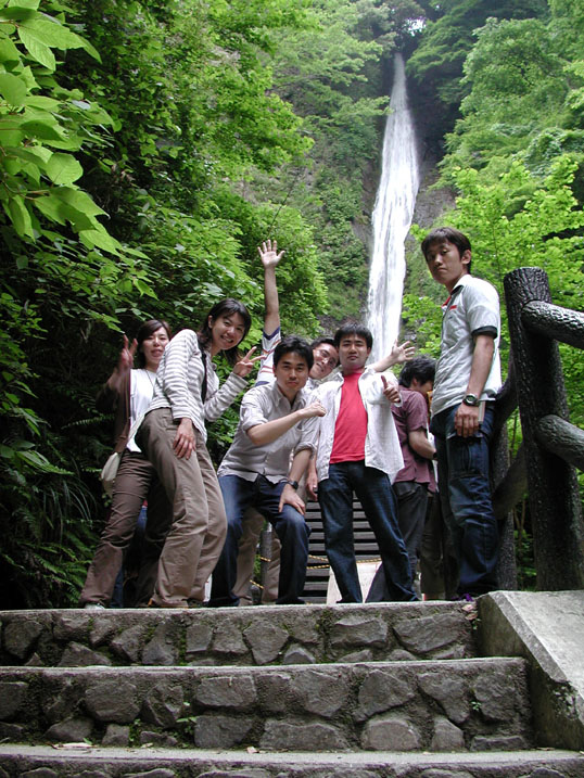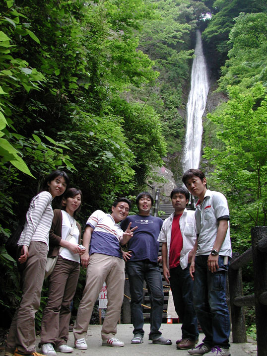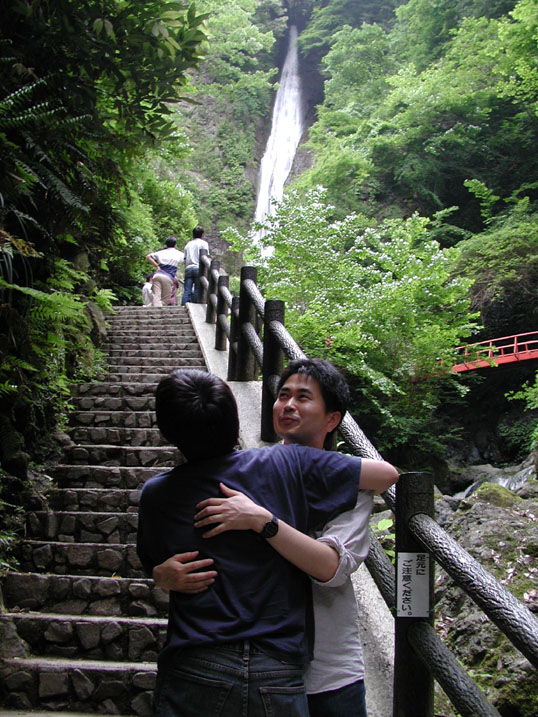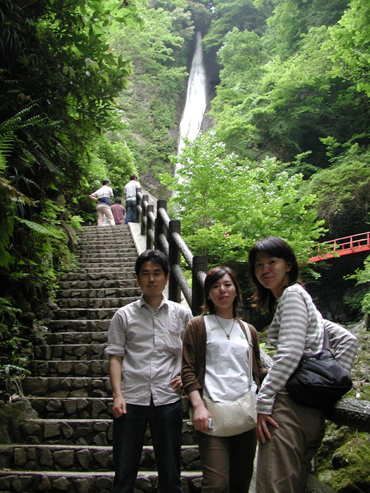 滝をバックに。