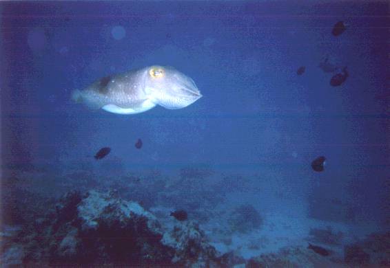 7日 昨日以上に良い天気、今日もファンは5人、体験多し。去年や一昨年は体験の方が少なかったのになあ、ガイドさんも大変だ。1本目は前島北。ファンのうち3人は、5本目と7本目で、インフレータの扱いもおぼつかないようだ。3人もつれ合うように水底を進んでいく。通った後はまるでバッファローが通った後のような砂煙(^O^)。