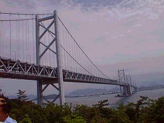 ![]() | 鳴門公園から見た橋全景。手前が徳島県鳴門市、向こうが淡路 島。海上の白いのは鳴門の渦潮。 | ||